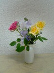 2005-03-20 花のある食卓? 雑記 ダンナの影響で、お花を買うようになった。去年、近所に安くてかわいいお花屋さんができてからは、ちょくちょく仕入れてくるようになった。 写真は今、食卓にある花。これだけかわいくて350円くらい。 あるだけで、気分が明るくなるし、チビにも大好評。「きれい」を連発している(前にも書いたけど、チビのきれいはお花という意味だが…)。